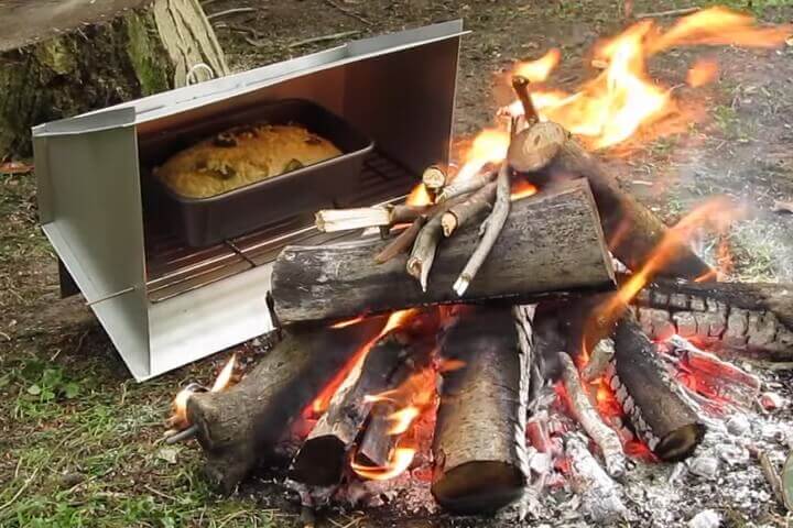 A volcano stove allows you to bake outside with propane, wood, or charcoal. Some models are collapsible and easy to store or carry.