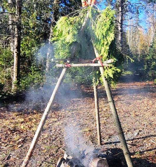 - Spruce, balsam fir, or white cedar boughs: This will act as the “roof” of the smokehouse. Avoid using white pine boughs as they tend to hang too low and short-needled pines don't provide enough coverage.